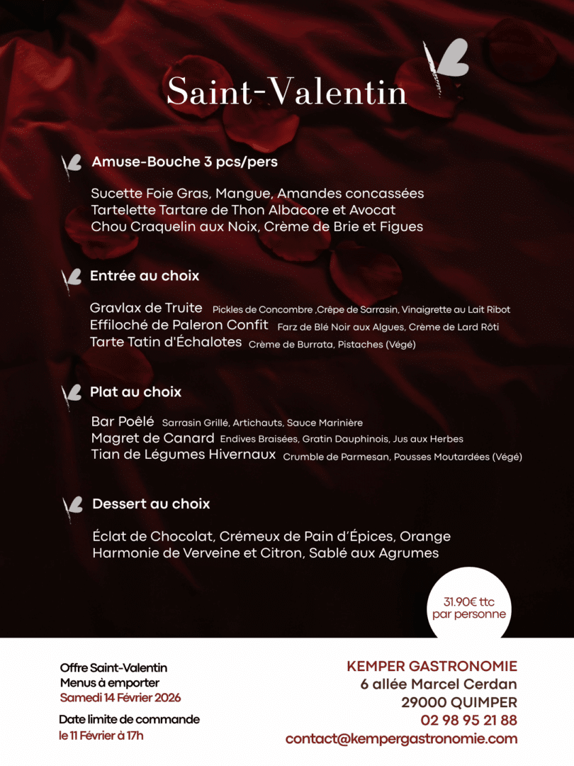 💖 Composez votre menu de Saint-Valentin avec Kemper Gastronomie ! 💖 ✨ Amuse-bouche, entrées, plats et desserts… Créez votre menu ! 🍷 Menu à emporter le 14 février : Profitez d’un dîner chez vous, aussi raffiné qu’au restaurant et passez un moment...